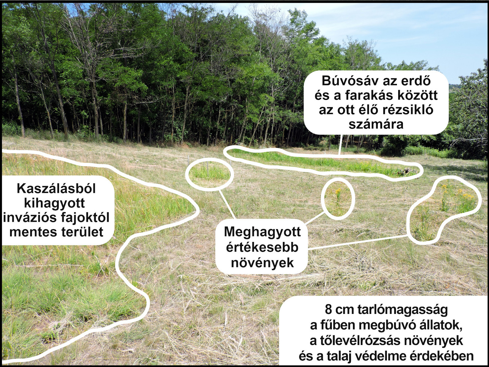 • Célszerű 10%-nyi, térben összefüggő mintázatot alkotó - inváziós fajoktól mentes - búvósávot vagy búvó foltot hagyni a területen az aktuális évre
