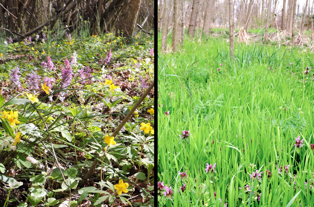 Elegyes tölgyerdő gazdag aljnövényzete és idegenhonos akácültetvény jellegtelen, gyomos gyepszintje.